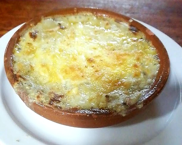 (Trocitos de Berenjena, jamón y gamba bañados en crema bechamel casera, todo cubierto de queso fundido al horno)