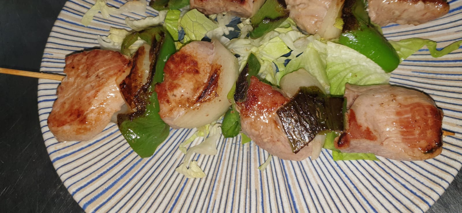 (Brocheta a la plancha de carne de solomillo de cerdo con cebolla y pimiento verde)