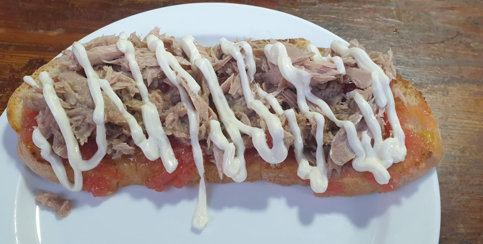 (Pan tostado con tomate rallado, atún y mayonesa)