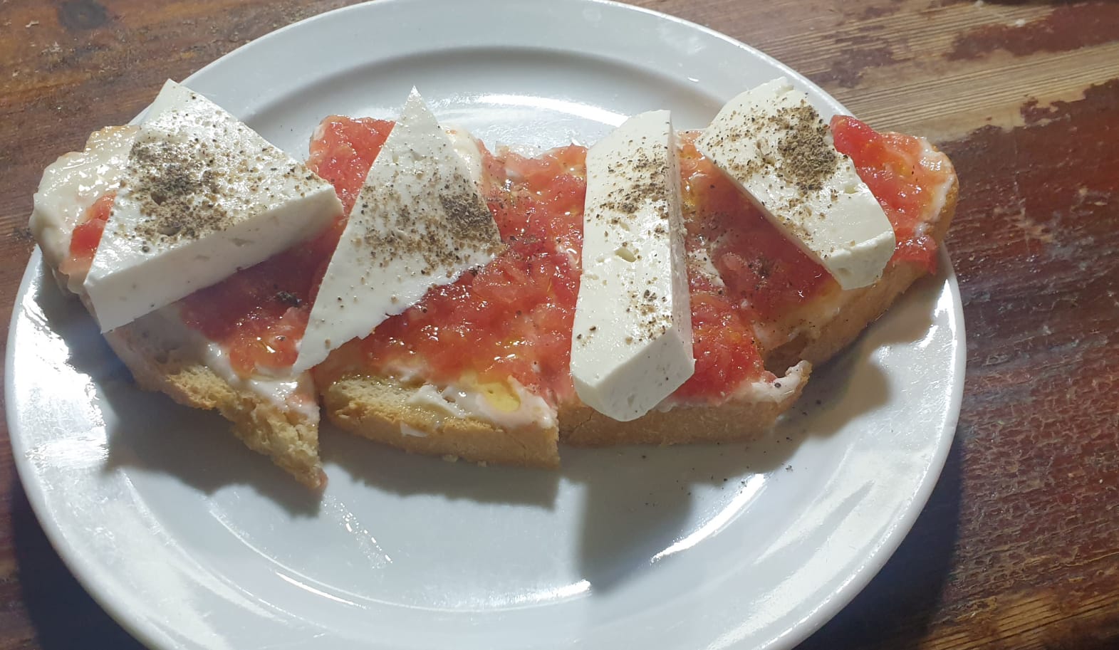 (Pan tostado con tomate rallado, alioli y queso fresco con un toque de pimienta)
