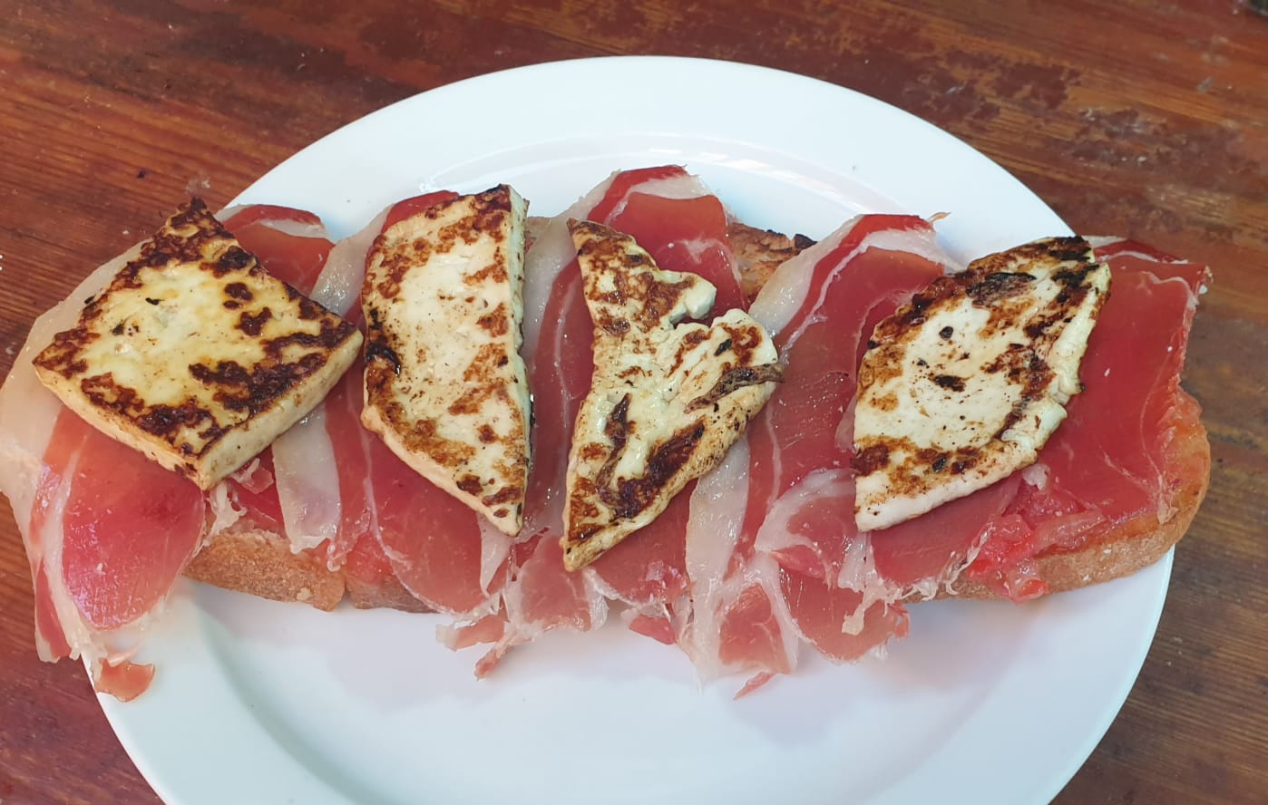 (Pan tostado con tomate rallado, jamón serrano y queso fresco a la plancha)